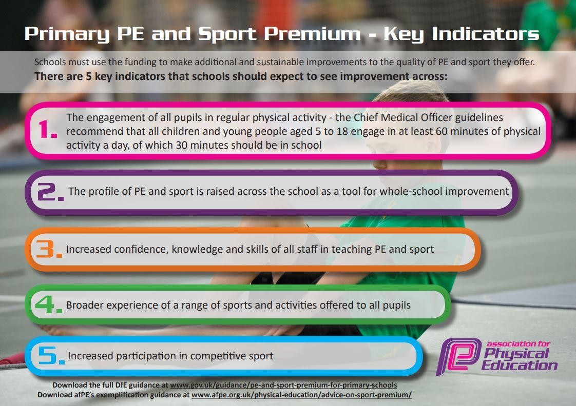 The impact on PE, school sport and physical activity is measured against the 5 indicators: